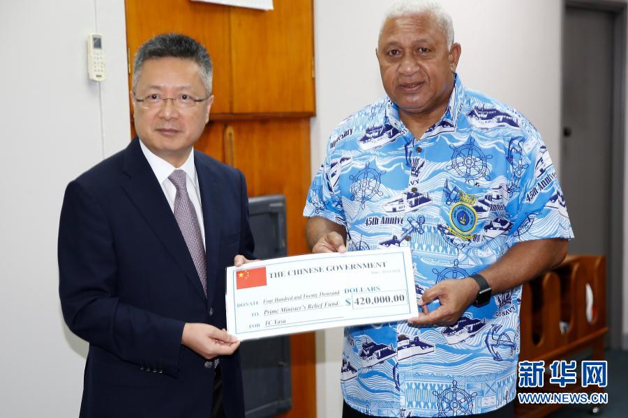 當天在斐濟總理辦公室舉行的儀式上,中國駐斐濟大使錢波代表中國政府向斐濟總理姆拜尼馬拉馬轉交了這筆援助款。