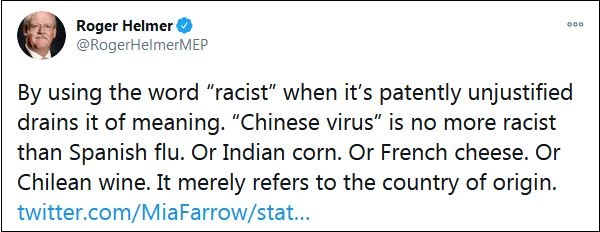大量網(wǎng)友在他的這條推特下,挖出赫爾默曾經(jīng)發(fā)表的言論。例如早在3月17日,赫爾默就在一條推特中宣稱:“在明顯不合理的情況下,使用‘種族主義’這個(gè)詞會讓它失去意義。‘中國病毒’和‘西班牙流感’一樣不是種族主義。就像印度玉米,或法國奶酪,或者智利葡萄酒。它僅僅是指原產(chǎn)國。”