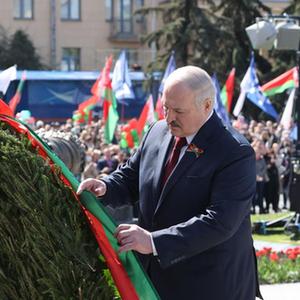 5月9日,白俄羅斯總統盧卡申科在明斯克向勝利紀念碑獻花。