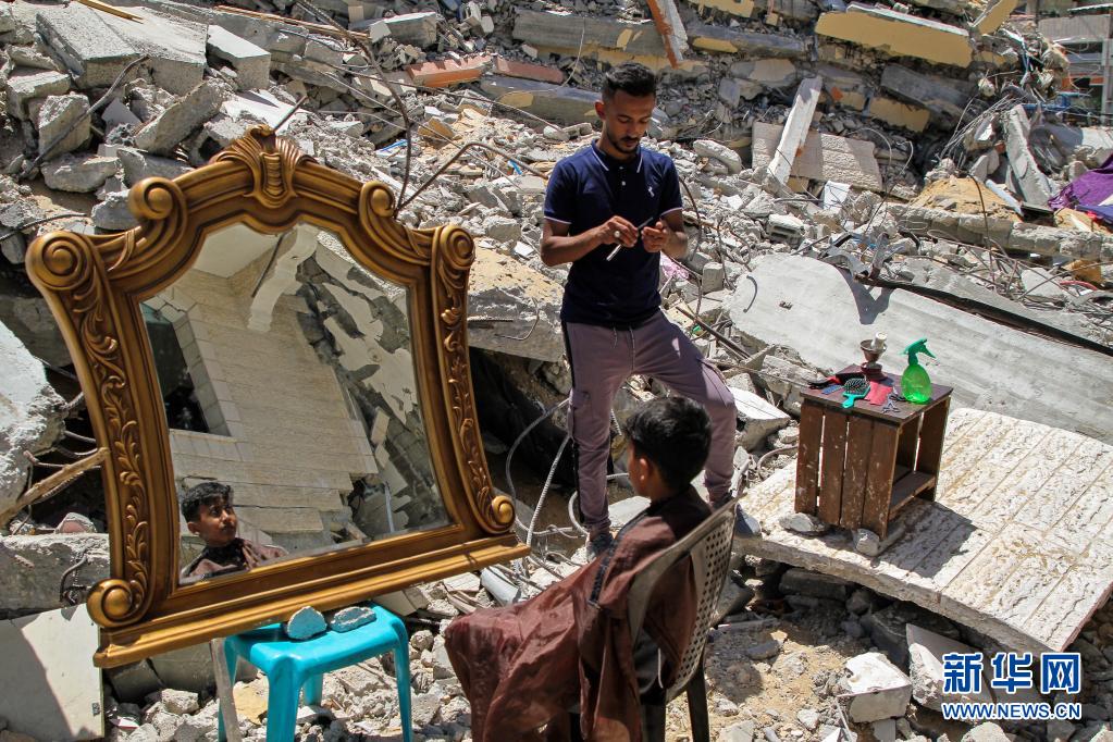 5月26日,在加沙地帶北部的城鎮(zhèn)貝特拉希亞,23歲的巴勒斯坦理發(fā)師阿卜杜拉·扎瓦拉在他被以色列炸毀的房屋前為顧客免費服務(wù)。 新華社發(fā)(里澤克·阿卜杜勒·賈瓦德攝)
