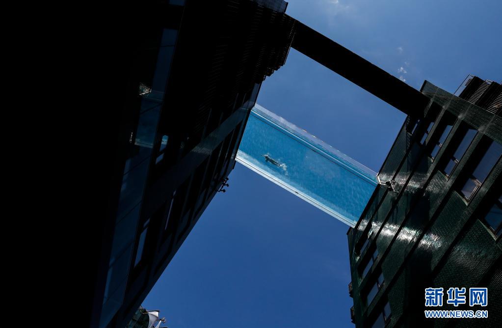6月2日,一名女子在英國倫敦南部一個建造于兩棟公寓樓之間的“空中泳池”游泳。