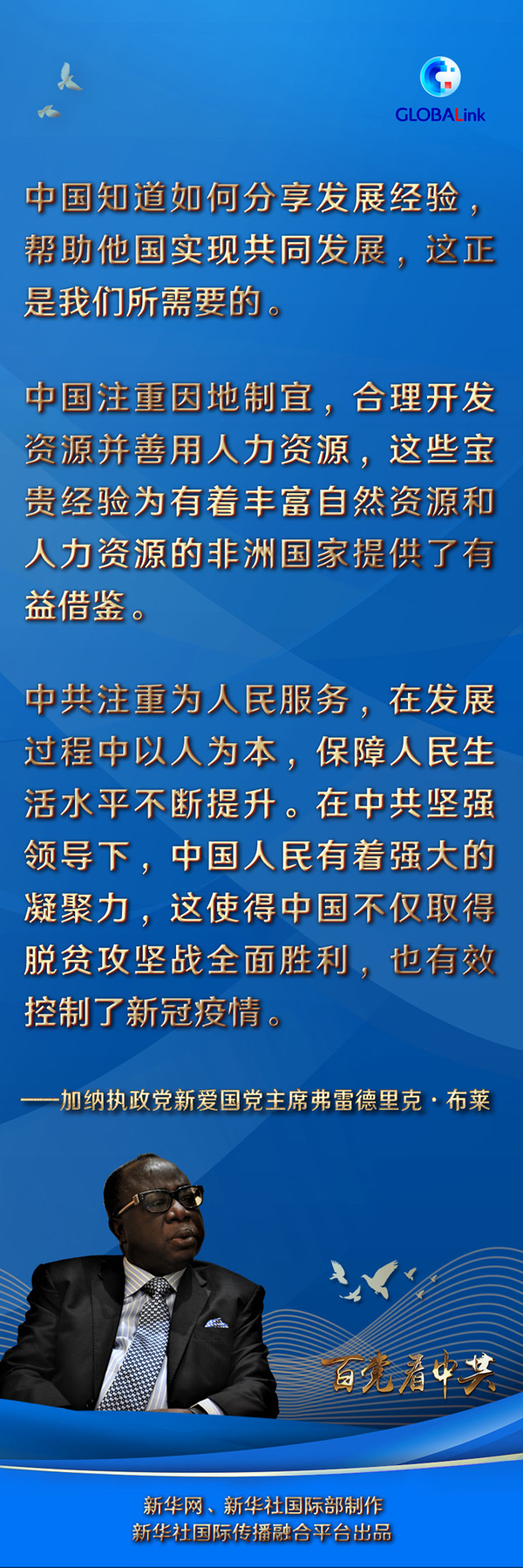布萊對中國共產(chǎn)黨成立100周年表示祝賀。他祝愿中國在中共領(lǐng)導(dǎo)下取得更多成功,促進(jìn)世界和平繁榮穩(wěn)定,同時(shí)希望加納新愛國黨和中共在未來能有更多交流合作。