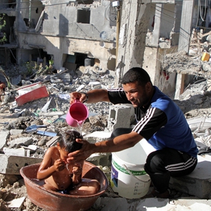 6月7日,在加沙地帶北部拜特哈嫩,巴勒斯坦人坐在遭以軍空襲損毀的建筑旁。