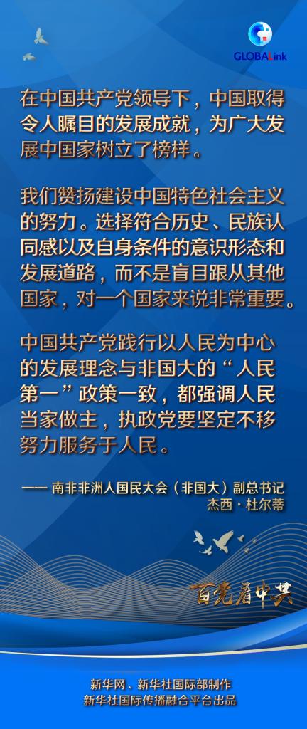 杜爾蒂說,2021年是中國共產(chǎn)黨成立一百周年,中國共產(chǎn)黨創(chuàng)造了一個又一個輝煌。“我謹代表非國大全國執(zhí)行委員會祝賀中國共產(chǎn)黨走過成功的百年。預祝中國共產(chǎn)黨在下一個百年中取得更大成就!”