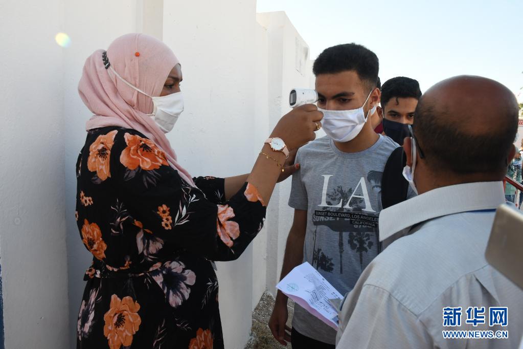 6月16日,工作人員在突尼斯首都突尼斯市一個考場外給準備參加高等學校入學考試的學生測量體溫。