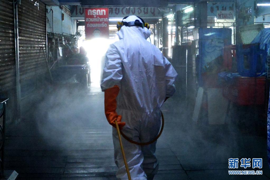 6月21日,工作人員在泰國首都曼谷一處生鮮市場進(jìn)行消毒。